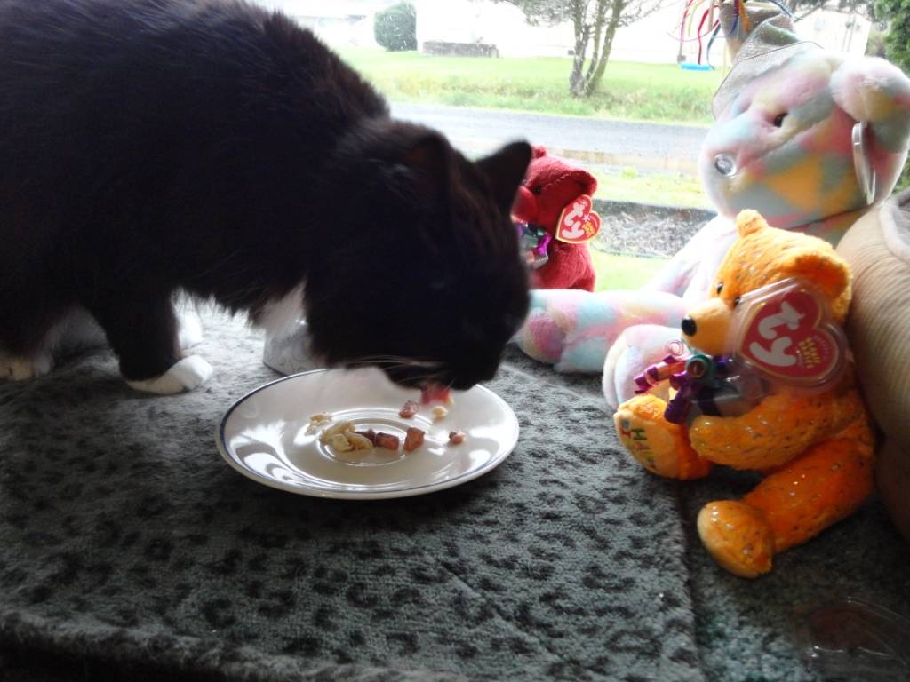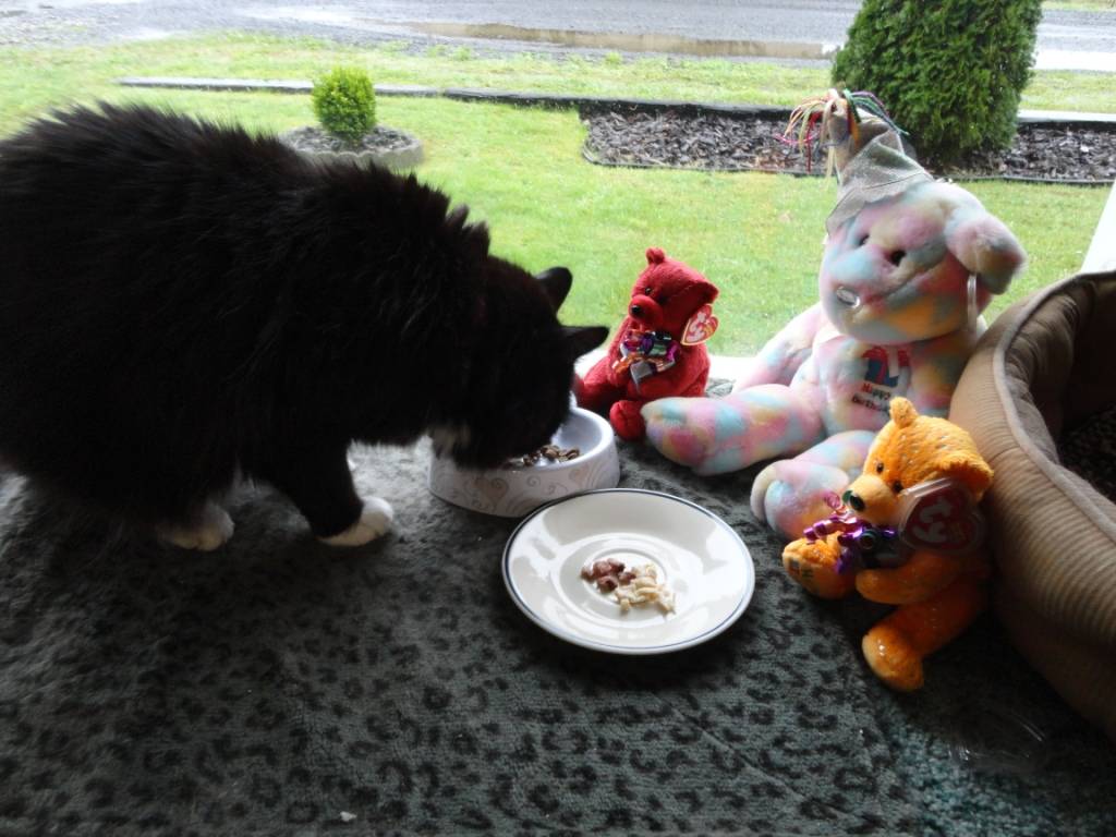 He enjoyed a day of play catnip, naps and posed for a lot of pictures for us, then he enjoyed hid Birthday dinner, his usual kibble treat combo with some diced chicken breast and Tri-Tip steak on the side!