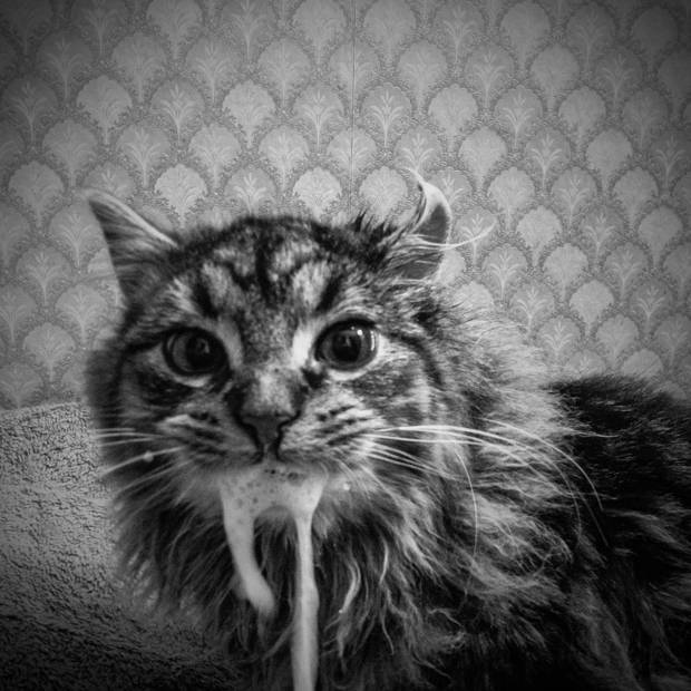 Oh my goodness not sure whether to call the cat a vamPurr or think it’s got rabies.