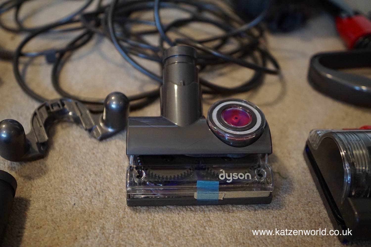 In common with other manufacturers, Dyson have brushes powered by the movement of air through the hose. The brushes work horizontally like a 4 toothbrushes tracing a pair of circles. As with all Dyson technology this isn’t difference just for the sake of it. The way that the brushes spin means that long hairs don’t get tangled up around a central spindle. Though we don’t have that problem with cat hairs, when we had a lodger with long golden locks we often had to take the scissors to our cleaner. In addition there are another couple of smart features which I liked about this tangle-free turbine tool. To control the amount of contact with the brushes there is a spring loaded base, gentle pressure on the head allows the brushes to contact the surface you’re cleaning. Release the pressure and they just skim the surface but with the suction going.