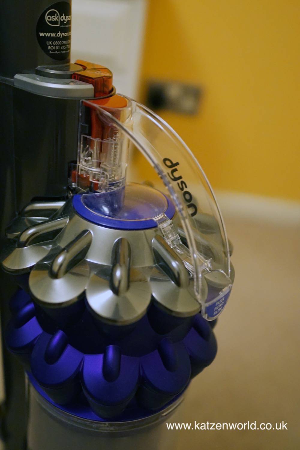 As with all models now, the cleaner came in a box and required a little self-assembling. The first thing I noticed was that it seems Dyson have not compromised on the quality of their products. Yes, the cleaner is made of metal and plastic just like the others but it just feels sturdier and the components have a satisfying and reassuring click when they join together. The assembled cleaner is actually very small in comparison to the models we’ve previously reviewed. Ideal when storage space is at a premium like at our place where we’re bursting to capacity with cat paraphernalia. It’s also very light – almost half that of my previous Dyson model. This is helped by the fact that the tools are not stored on board giving extra weight and bulk (although I realised there is a place to put a couple of the tools if you want to keep them to hand). The handle, while not height adjustable does move down , again, to reduce the storage space.