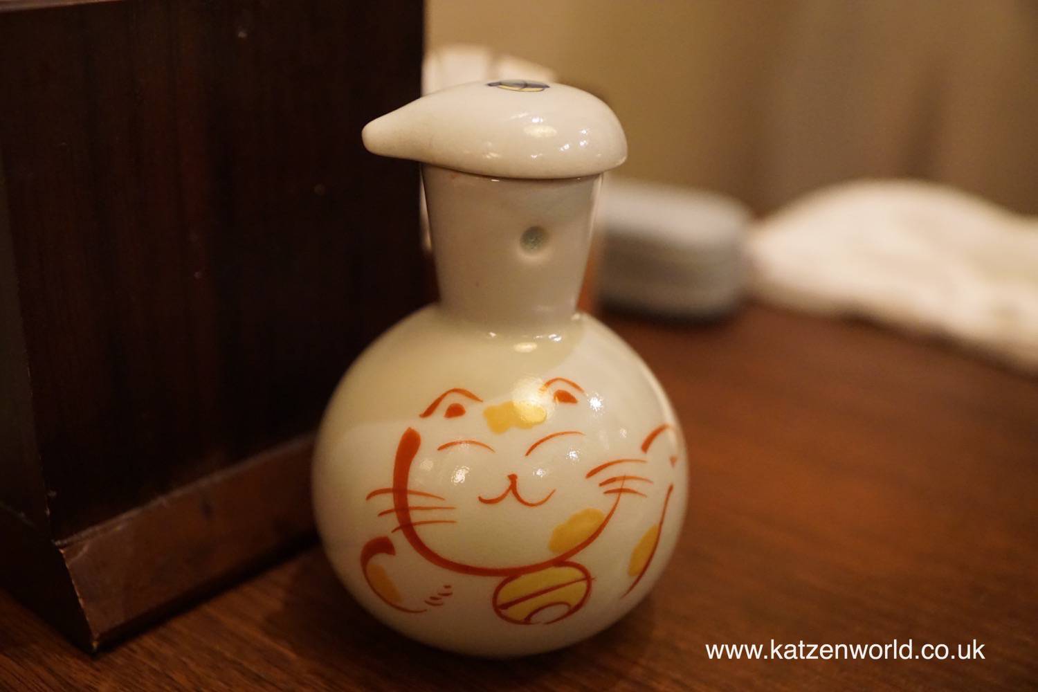 As we opened the door and walked in we guessed that there were no actual cats inside but weren’t expecting to find such a treasure trove of everything to do with cats. Every corner of the place was covered in cat related items from cute collections of cat figurines, posters and even bottles of sake. One of the posters features a rework of one of Marc’s favorite anime “Uch? Senkan Yamato – Space Battleship Yamato” changing “Yamato” to “Nyamoto”; “nya” being the Japanese word for “meow”. Although there were no cats in sight there was a wall of photos showing customer’s cats.