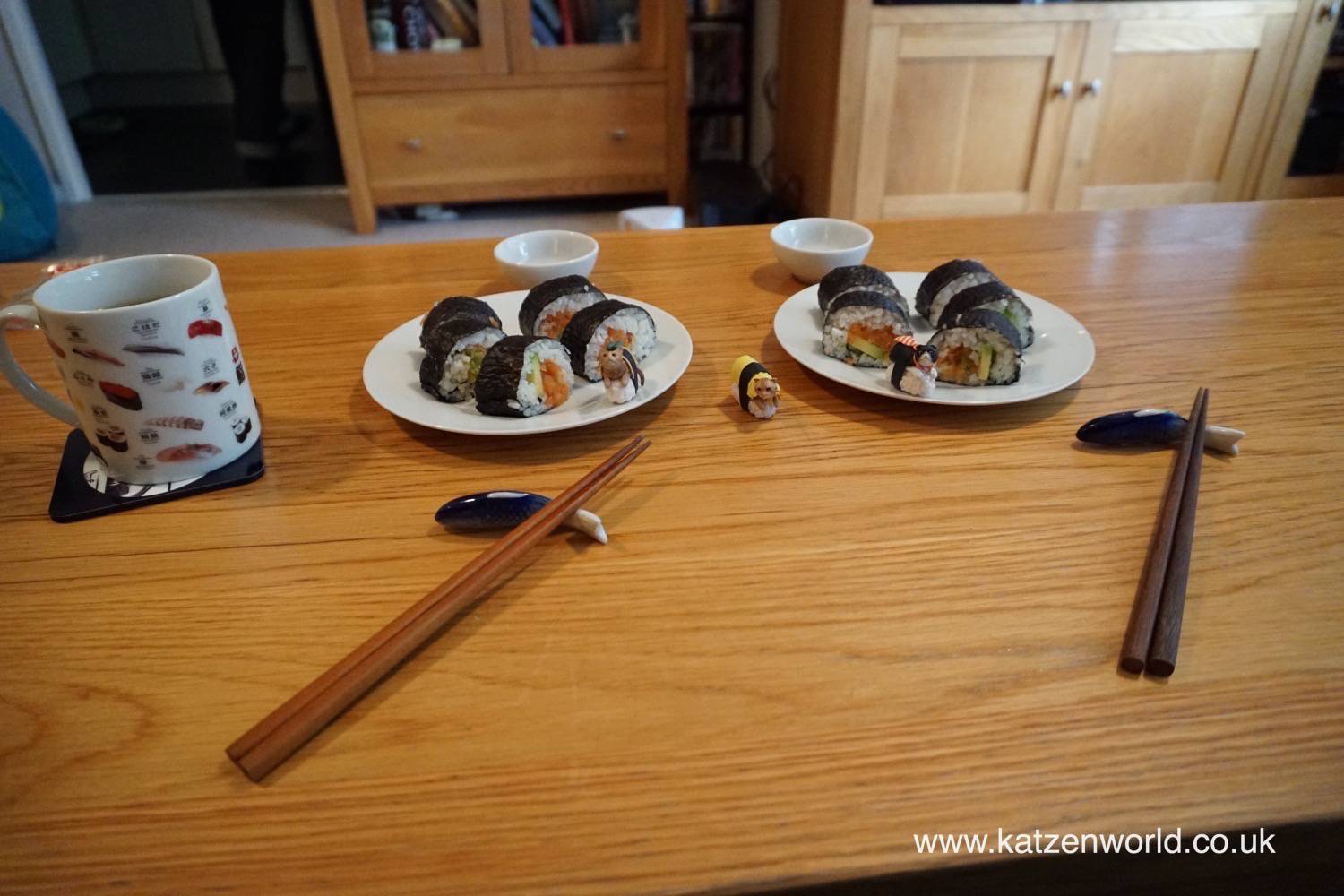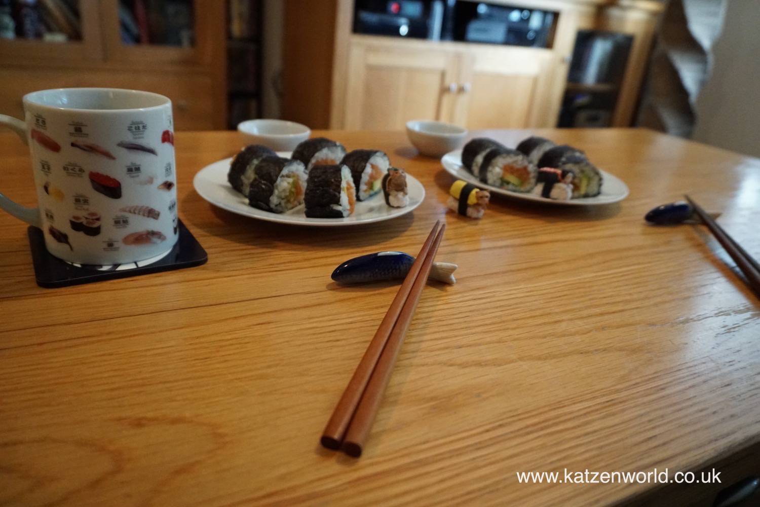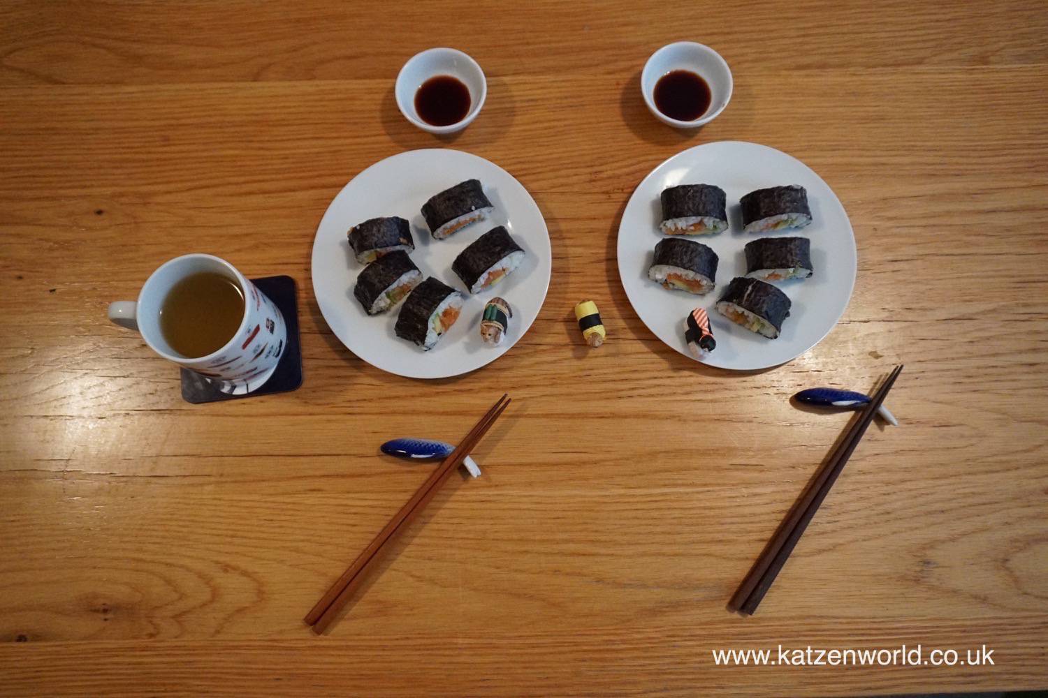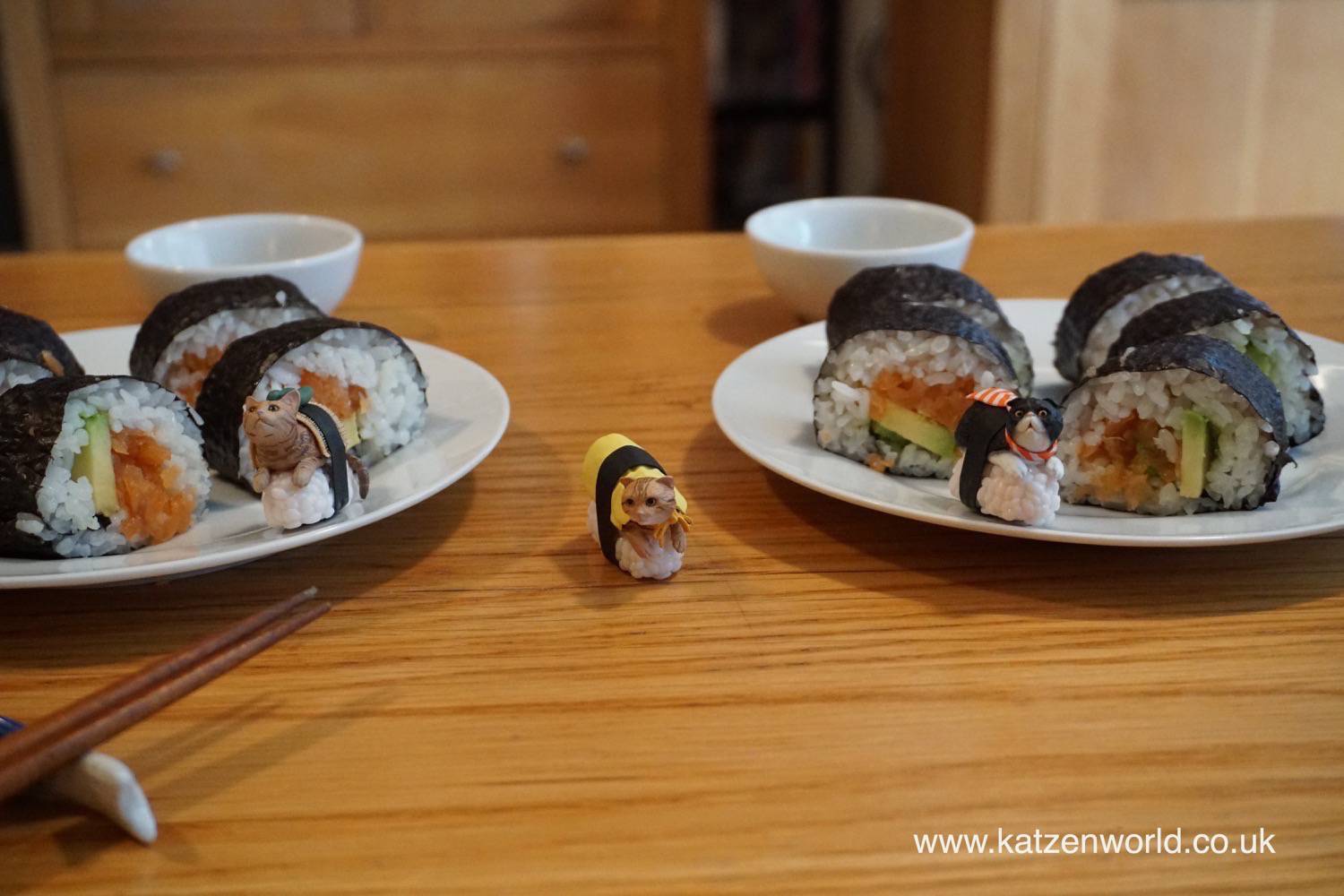 The three little cats immediatly gave us the idea that once back home we should try and make our own Sushi! While this didn’t happen immediately we found out about the Yutaka Sushi Making kit for two a few months after our initial idea. And thus after we got our hands on it the Sushi Cats got to sit around our own homemade Sushi. ;D