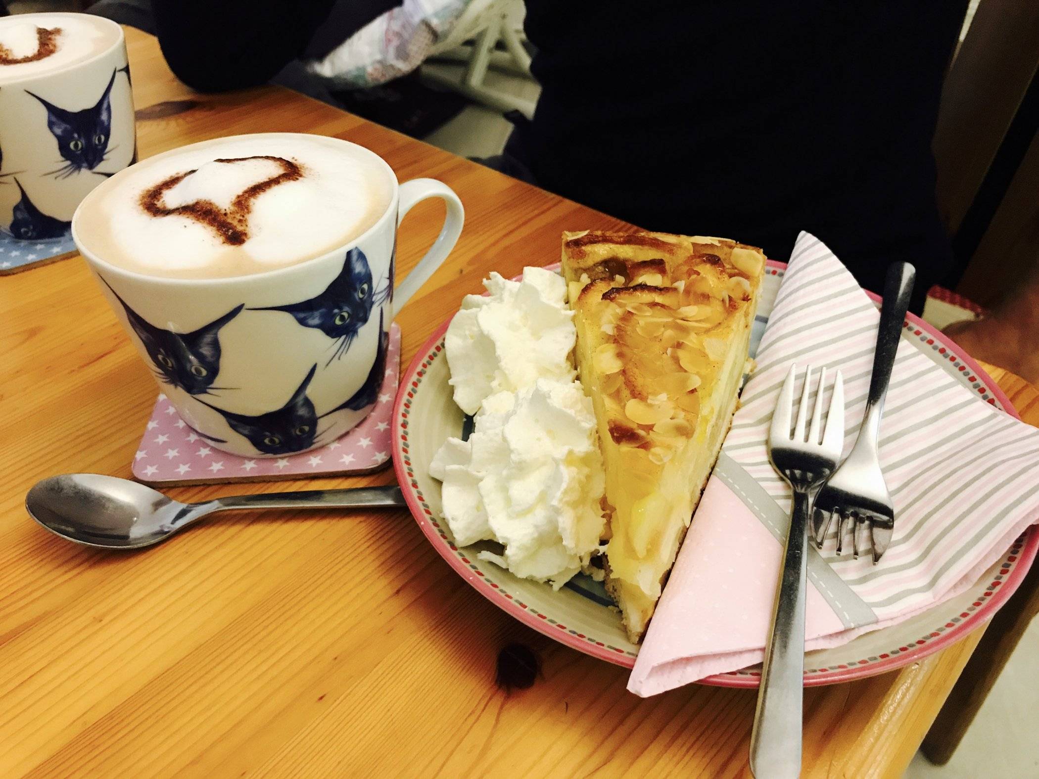 I knew I was in the right place when we walked and saw a sleeping cat in a baby push chair. Navigating through the cute and cozy space, it was crowded being a Saturday afternoon, but we were promptly greeted by the friendly staff who spoke to us in English (Danke Schön!). We ordered two lattes and split a slice of apple tart, all of which were delicious.