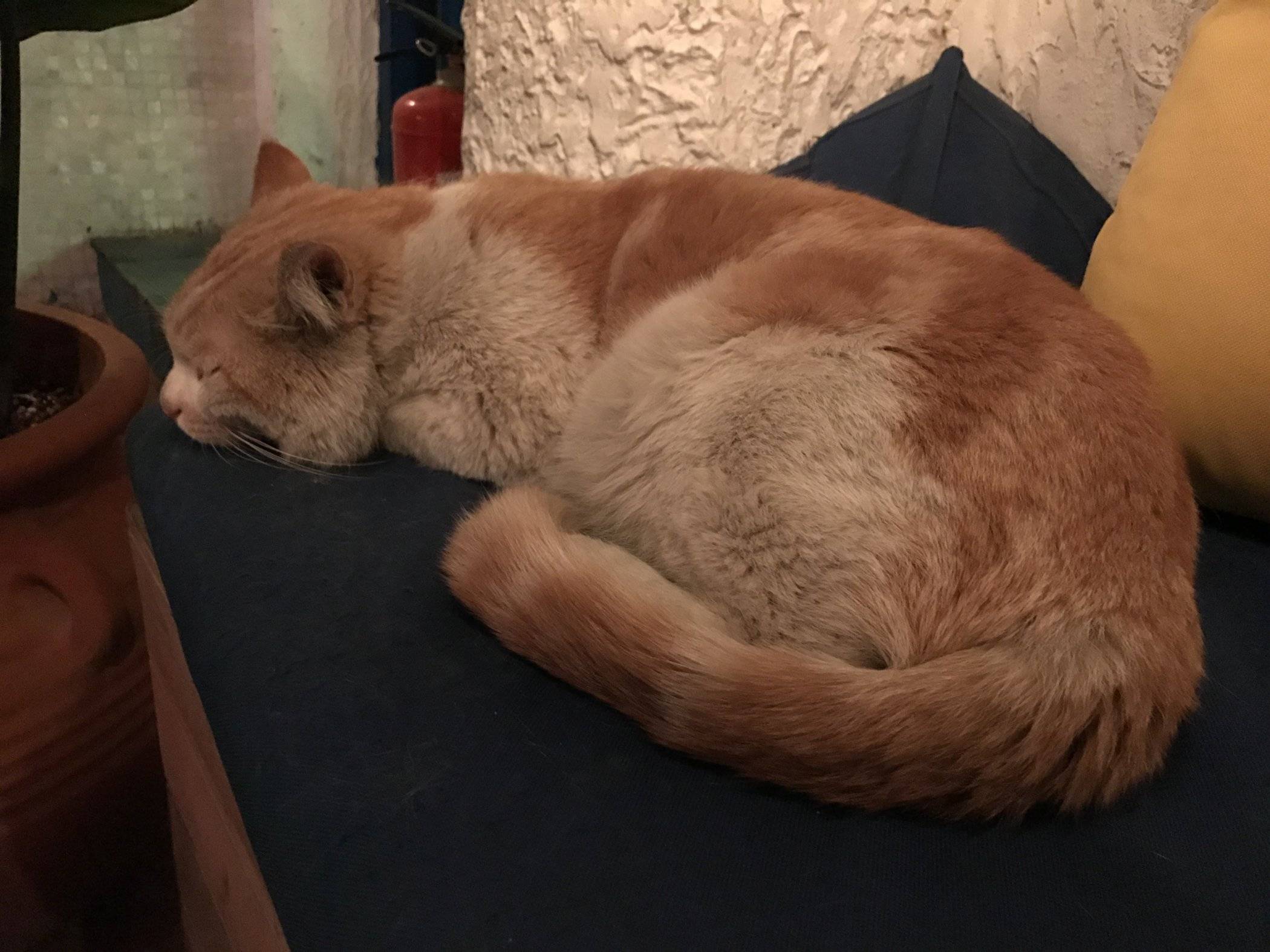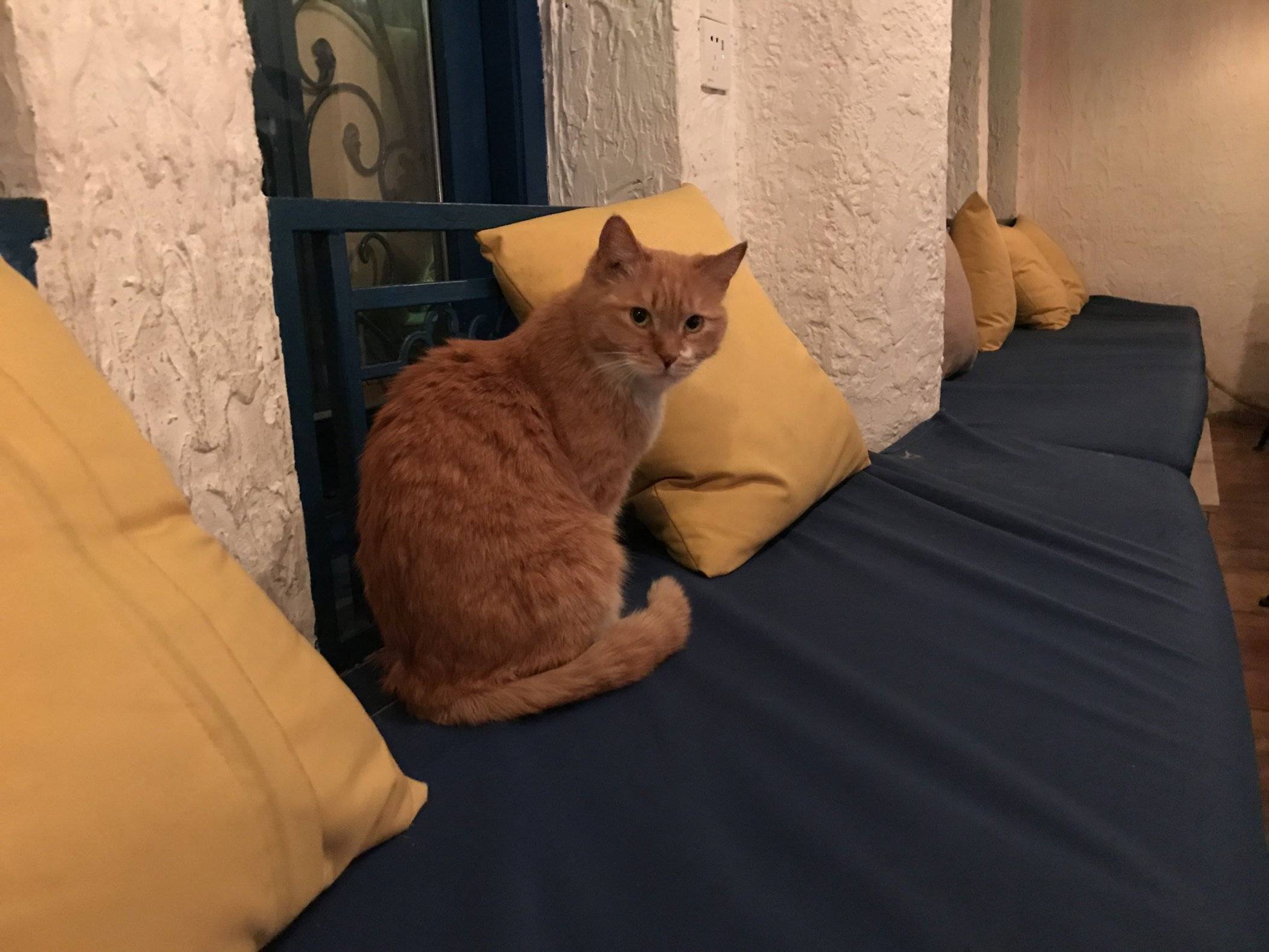 Cozy at our pillow filled table near the bar, we sipped our cocktails next to a sleeping white and ginger kitty that was clearly a street cat as his underbelly was more gray from dirt than white. His pal, another ginger, was a bit skittish and watched us warily as I snapped some photos. Hearing noise upstairs, my partner volunteered to have a peek, later informing me that it was a restaurant with a lovely balcony, but he didn’t spot any more cats.