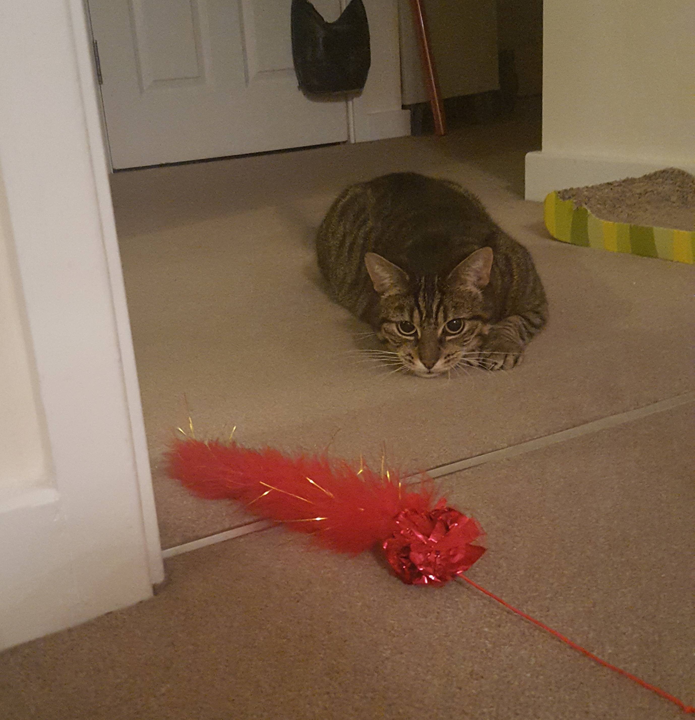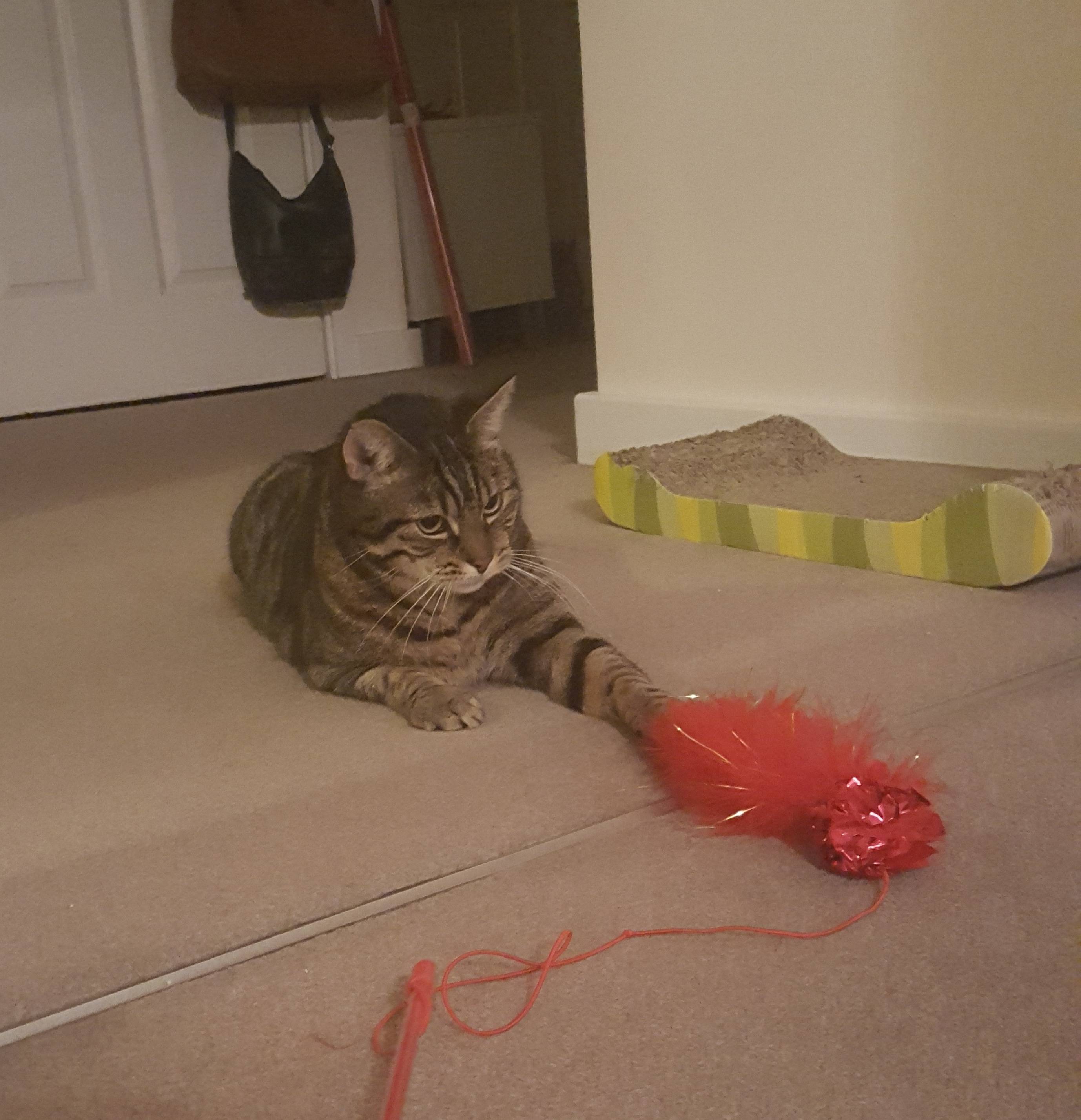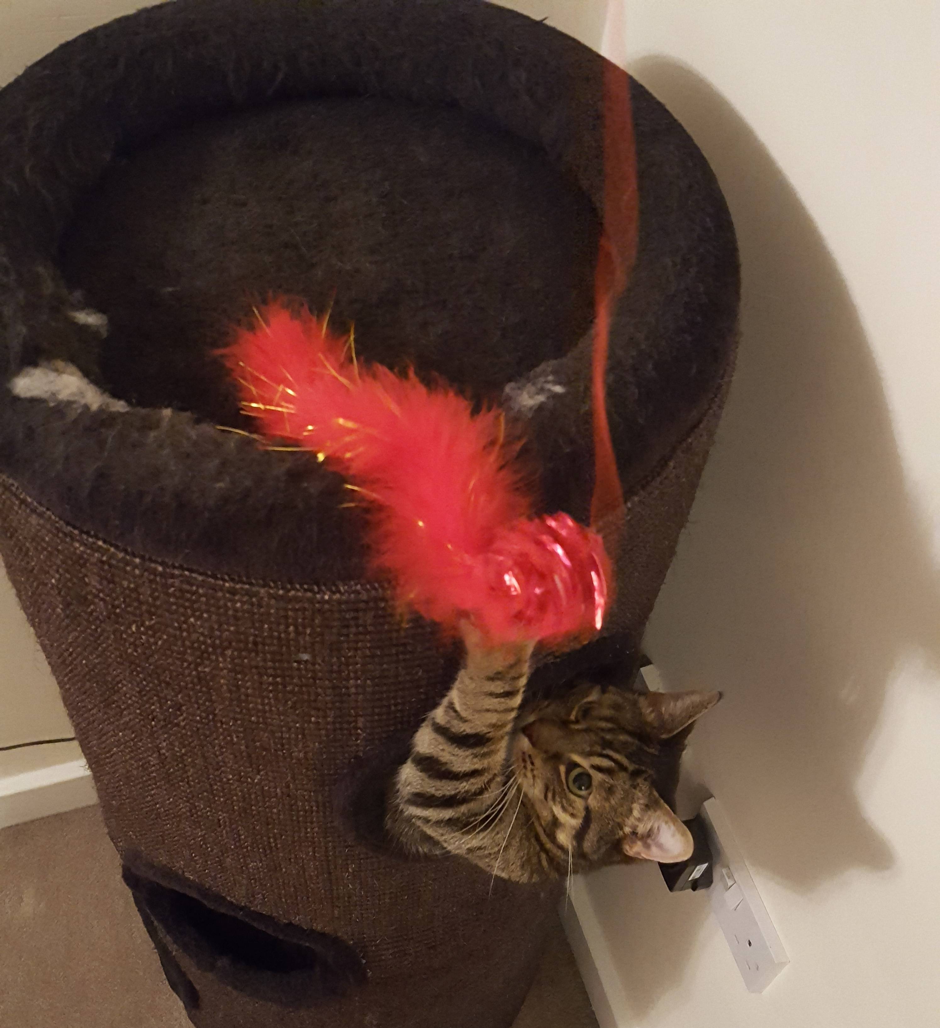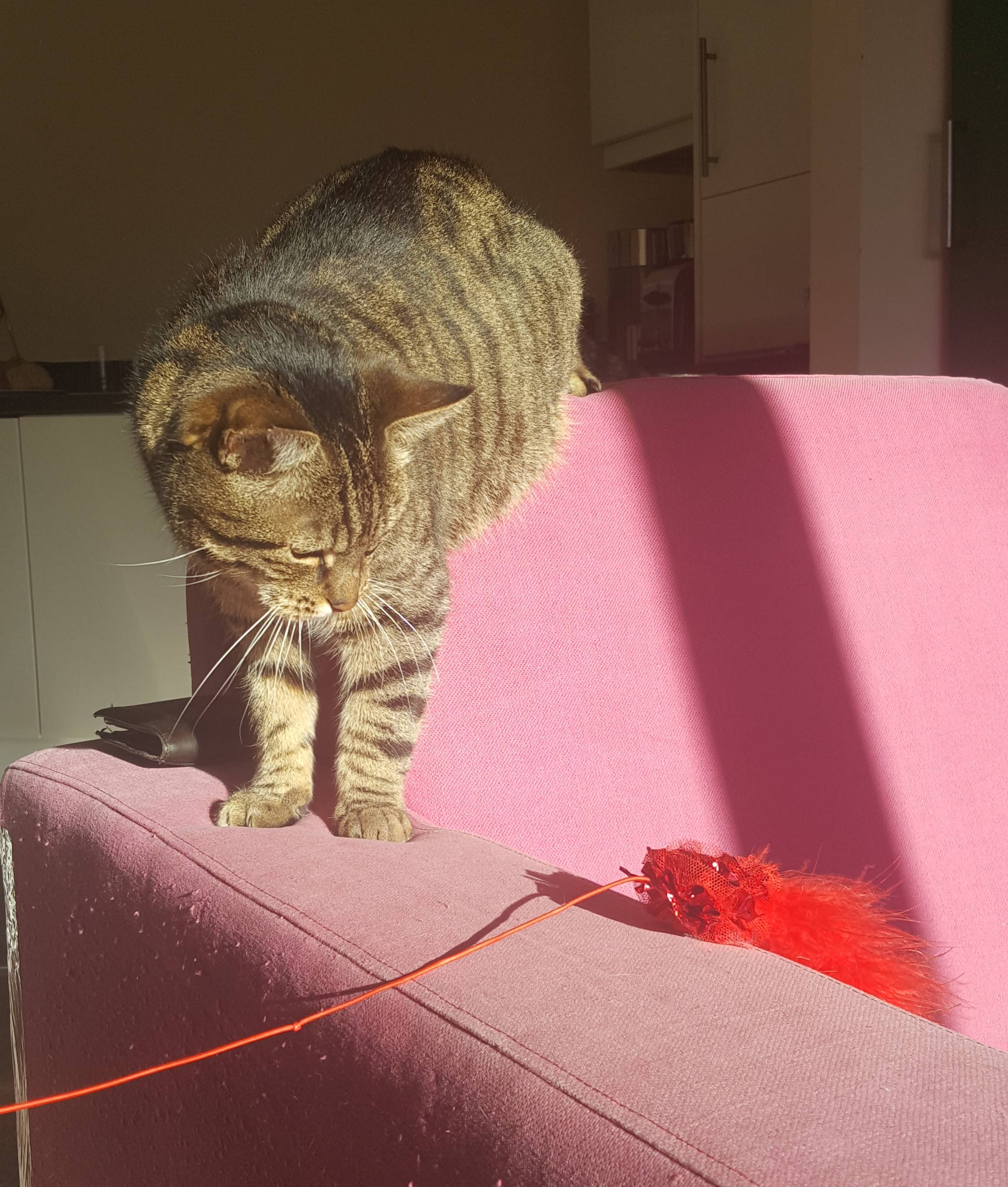 Dirk loves when we play together as the interaction means the toy is less predictable. In the wild, chasing prey is also unpredicatable and from Dirk’s body language and the look in his eyes you can tell he’s very focussed and in hunting mode when playing with this toy. You can add some extra variety to the game by dangling this toy over your cat’s scratching post or your sofa. This means they will have to jump and climb to get to the toy and are a lot more active as a result.