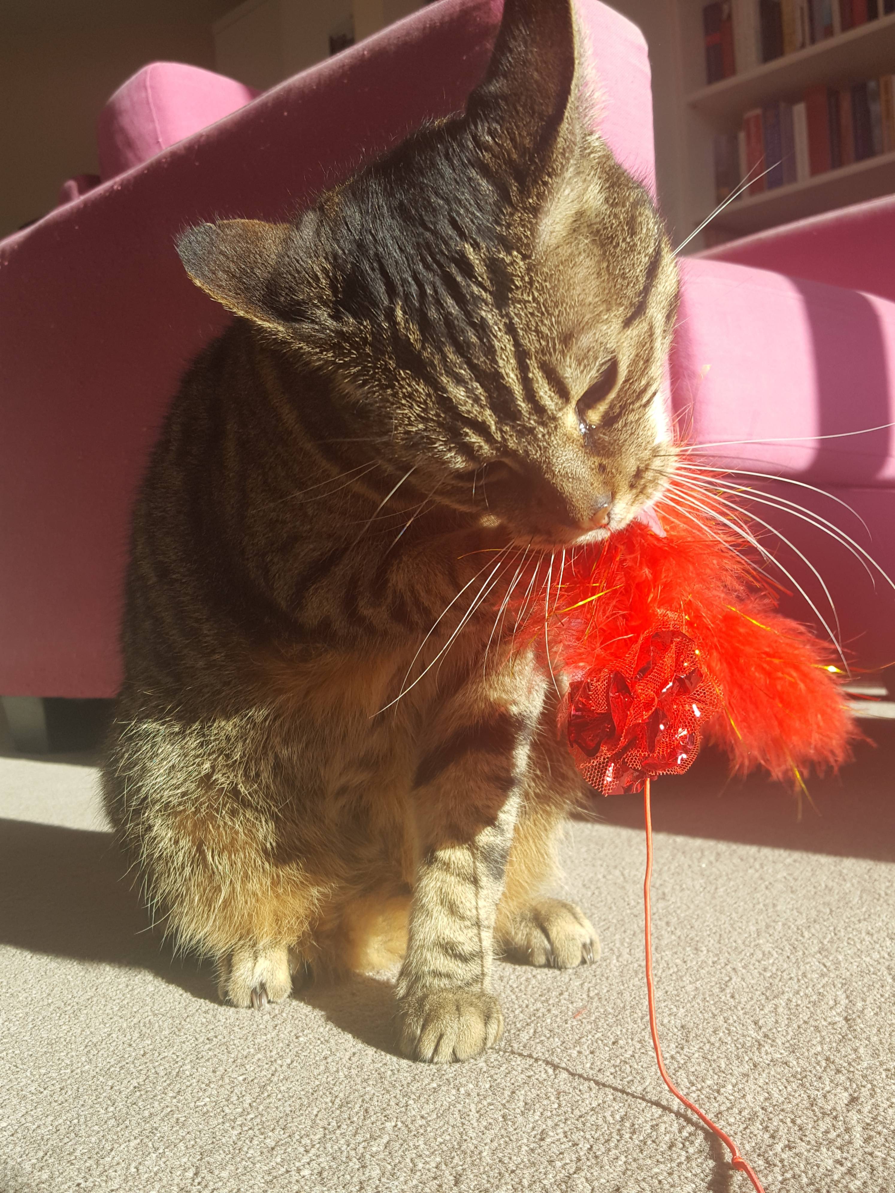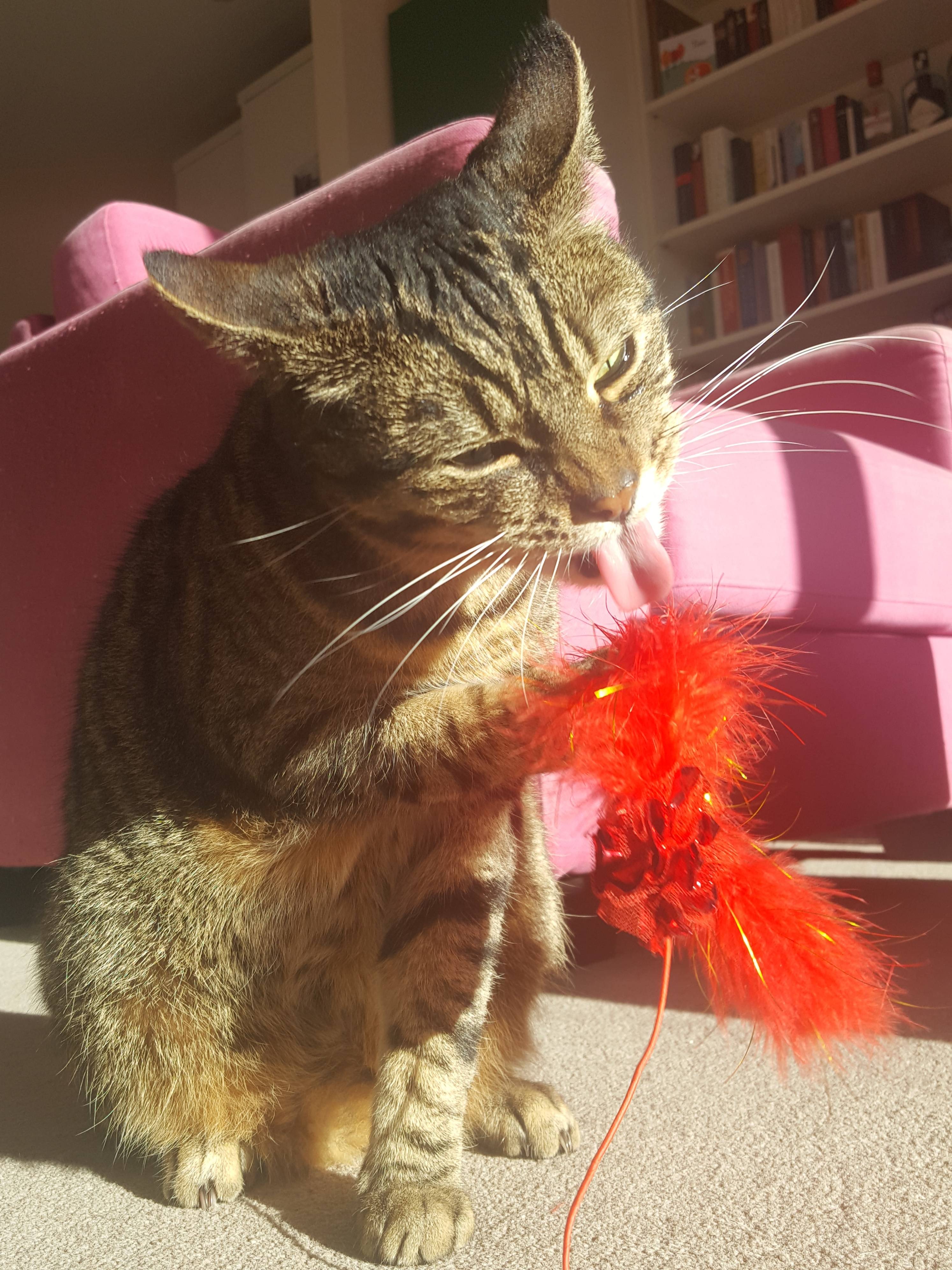 When you notice your cat is no longer in a hunting or chasing mood you can reward them by giving them the toy. Dirk sometimes drags it along to “his lair” (aka his bed) or he licks the feathers on the spot – much like cats do with their prey in the wild. Dirk has a very satisfied look on his face when he gets hold of the Teaser Wand after chasing it for a while. I’m sure your cat would too!