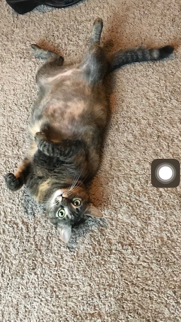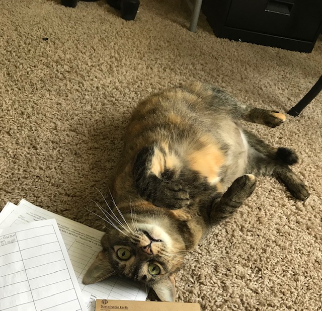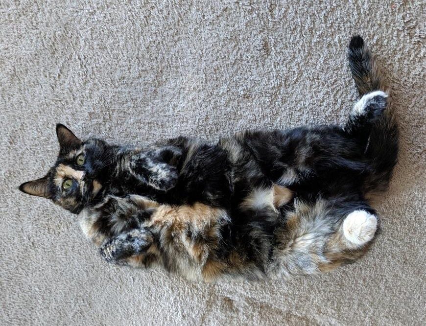 “This is my beloved kitty Stinky looking for her tummy rubs. My friend working on a cattle ranch in California found her abandoned with her brother Big Head Ed in a box in the mud, saved them, nurtured them to health, and I adopted her to join my small family. And she STAYED small in size, even at 17 in this picture, people thought she was still a kitten. But despite being tiny, she was HUGE in personality, always greeting our visitors and kneeding the blanket on me until we both fell asleep at night.