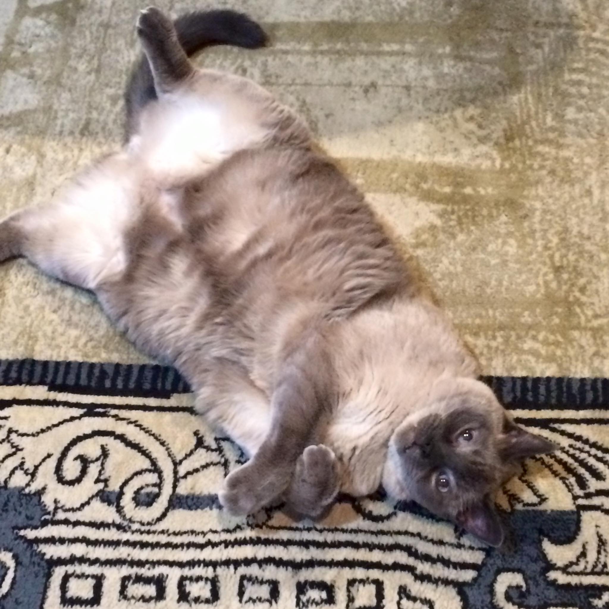Blue was a rescue who came with a big attitude. Definitely the alpha male! But he’s generous with the purrs and snuggles. He is a BIG boy – 21 pounds, very tall with huge feet and head. He towers over the other cats, and the household dogs give him a wide berth. So even though he looks like a Siamese, his size says he is not purebred.” Cecelia – Sent in via email